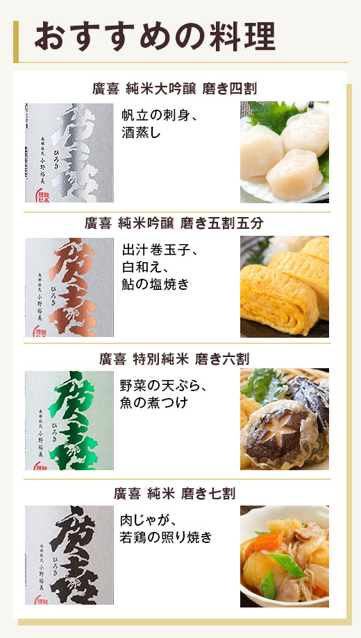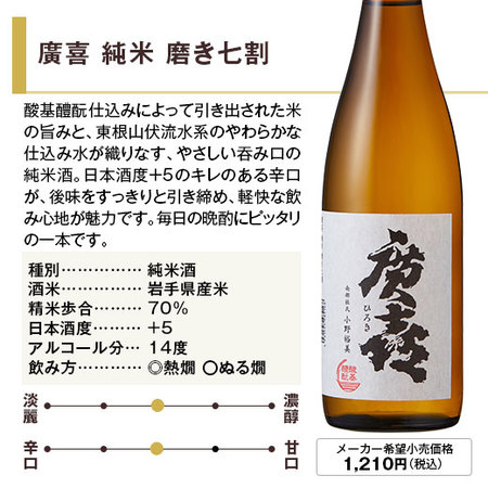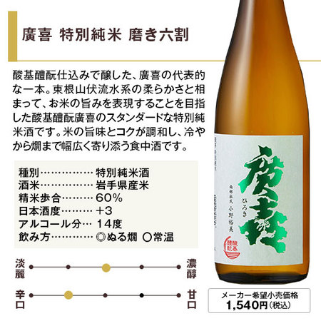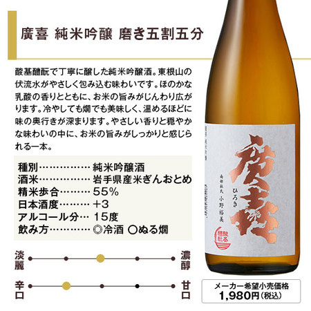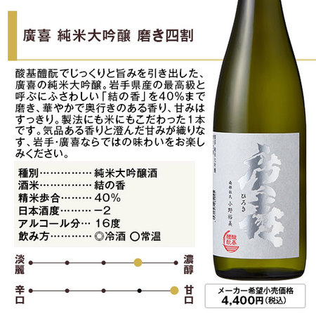 南部杜氏発祥の地、岩手の紫波に蔵を構える紫波酒造店から「お米のうまみ」をテーマとした廣喜を、種別による味わいの違いを感じ取れる贅沢なセットにしました!冷酒では、爽やかな味わいと優しい香りが光り、燗酒では米の旨みがしっかりと感じられ幅広く楽しめます。